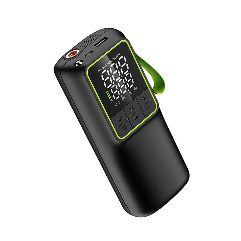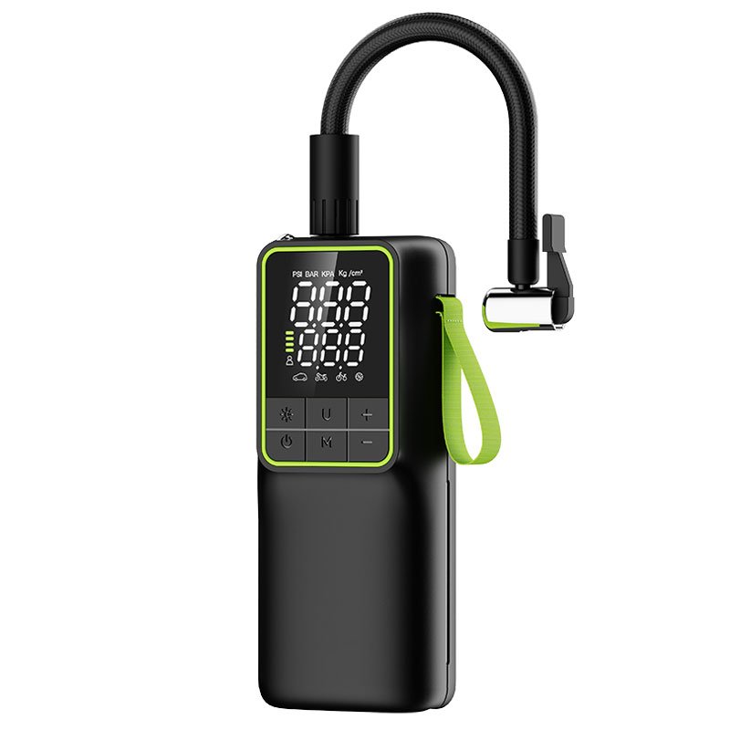 A portable smart electric tire inflator with digital display, fast inflation up to 150 PSI, and auto shut-off for safe and accurate use. Designed for cars, motorcycles, bicycles, and more, it features a rechargeable battery, emergency light, and compact design, making it a practical product for distributors and wholesalers.